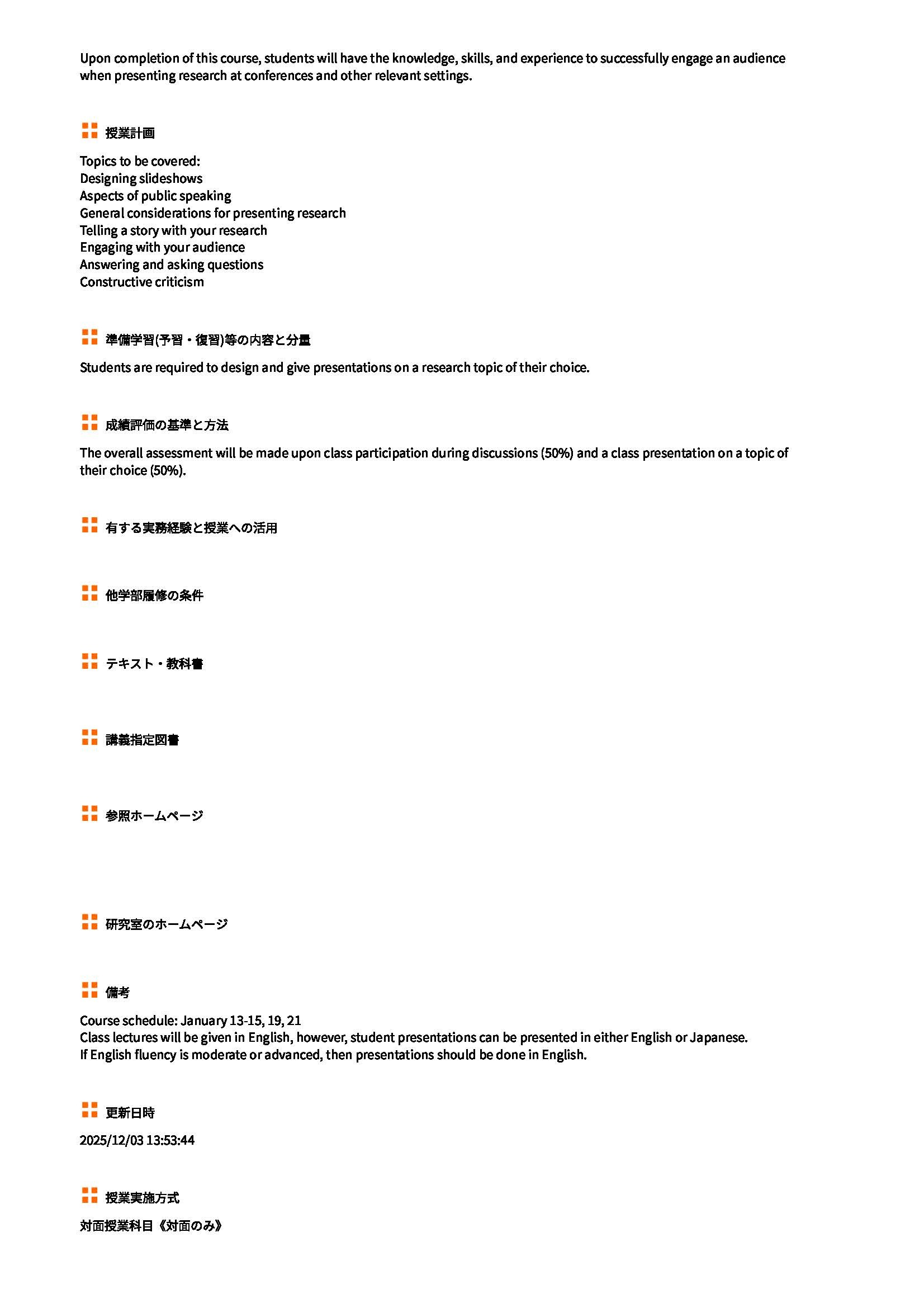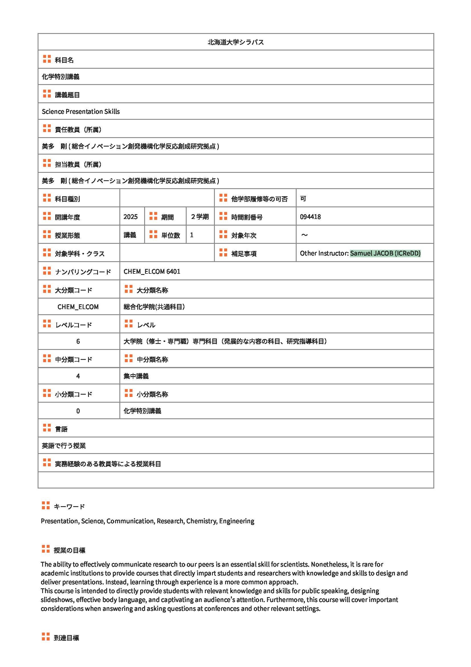 来週連休明けの1/13-1/21まで、ICReDDのSamuel Jacob特任助教が「Science Presentation Skills」として英語でのプレゼンテーションの基本やコツを教授する集中講義を予定しています。Jacob特任助教(https://www.icredd.hokudai.ac.jp/ja/jacob-samuel)はカリフォルニア州立大学サンタバーバラ校で学位を取得した後、名古屋大学のWPI-ITbMでは博士研究員を務め、約1年前にICReDDに着任しました。専門は電気化学を中心とした金属錯体化学で、アメリカのTop Universityの一つで学位をとった専門知識を有する研究者によるPresentation Skillに関する本講義は、国際会議での発表を目指す学生にとってはもちろん、これからの社会で活躍する大学院生として是非、身につけておいて欲しい内容となっています。大学院生向けの集中講義ではありますが、若手教員、博士研究員等の受講も歓迎です。